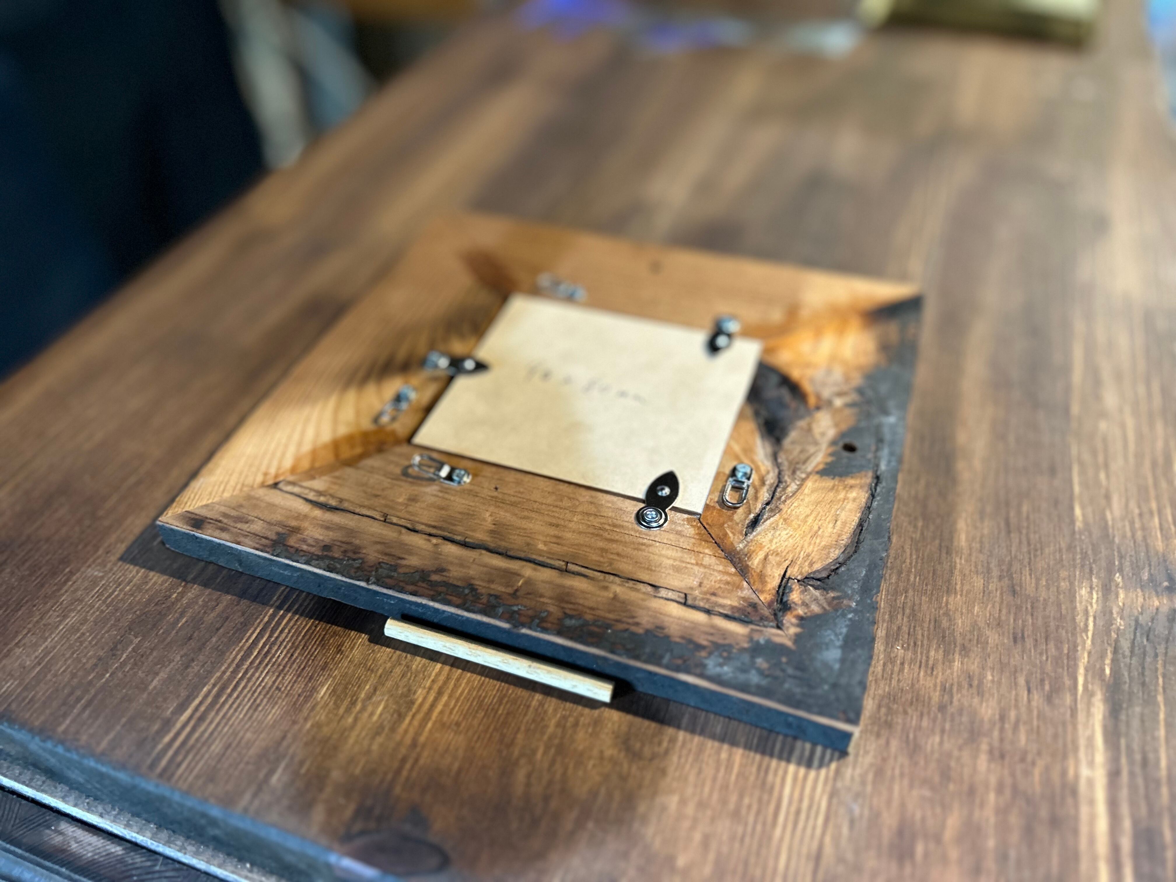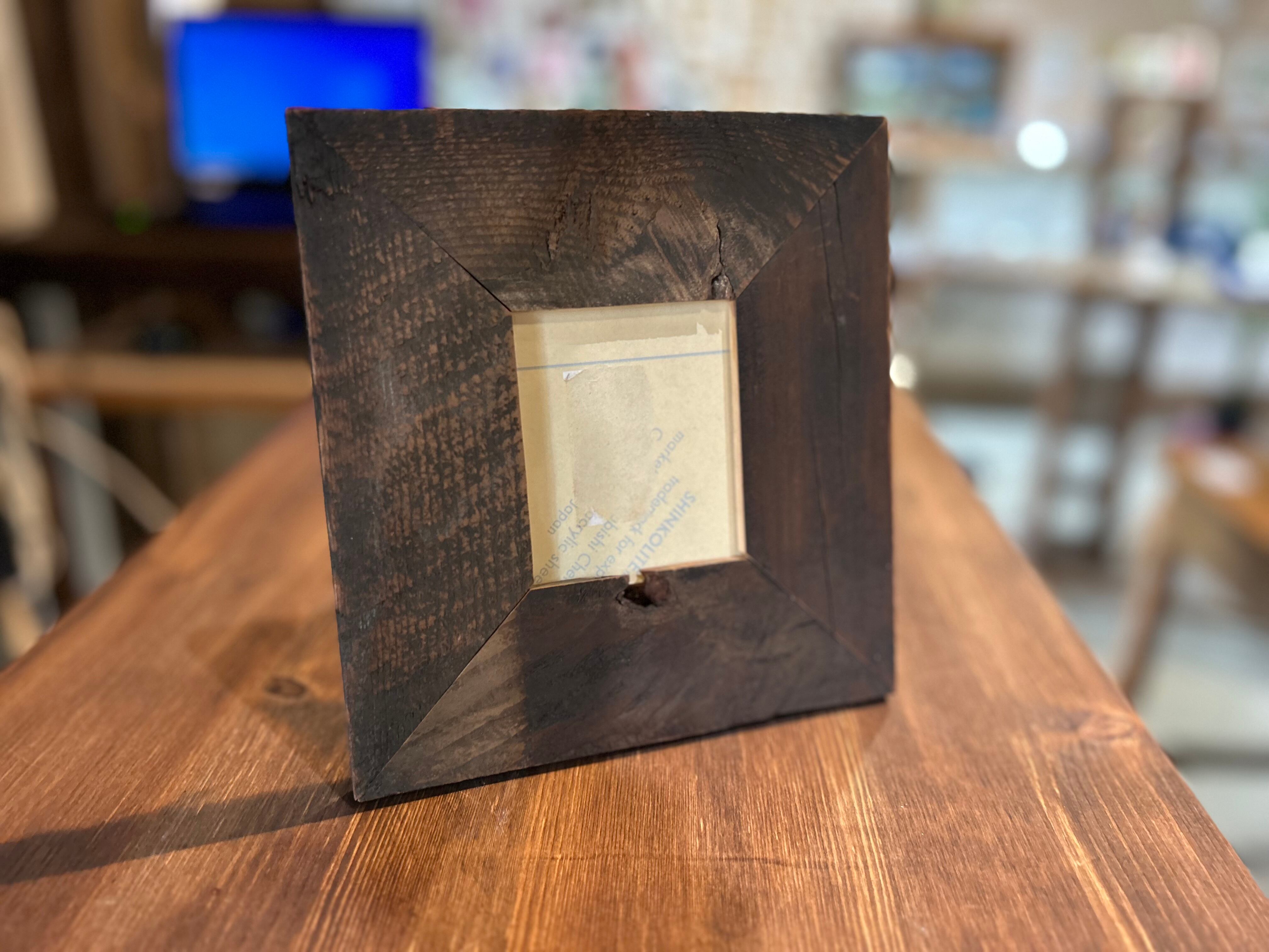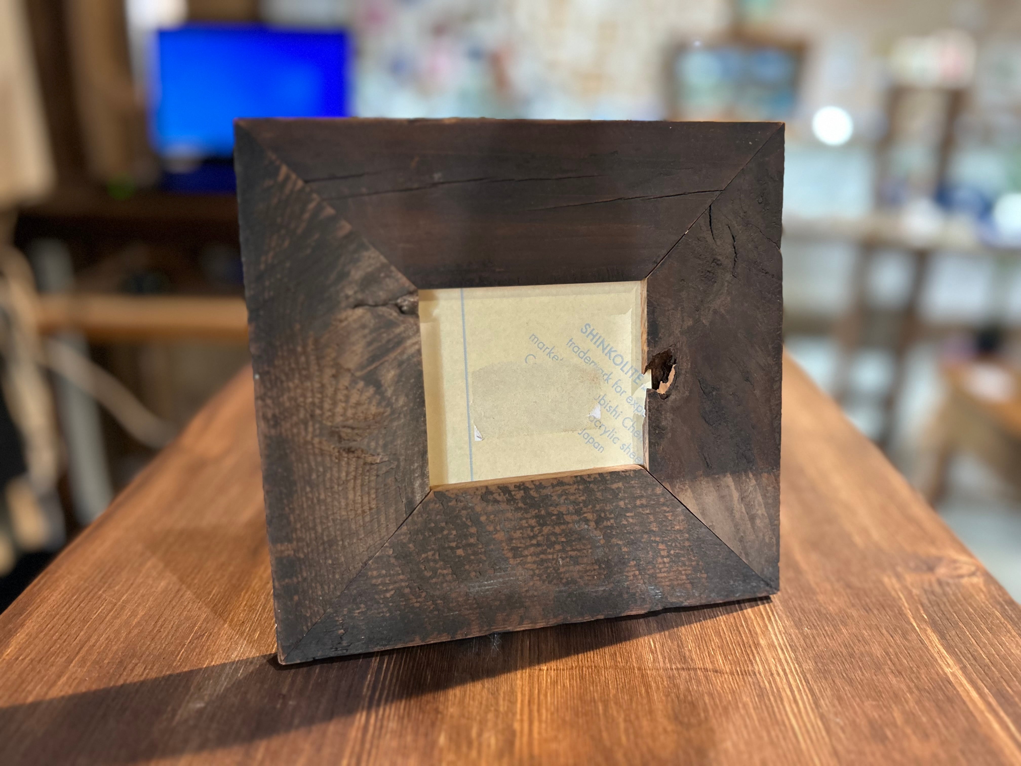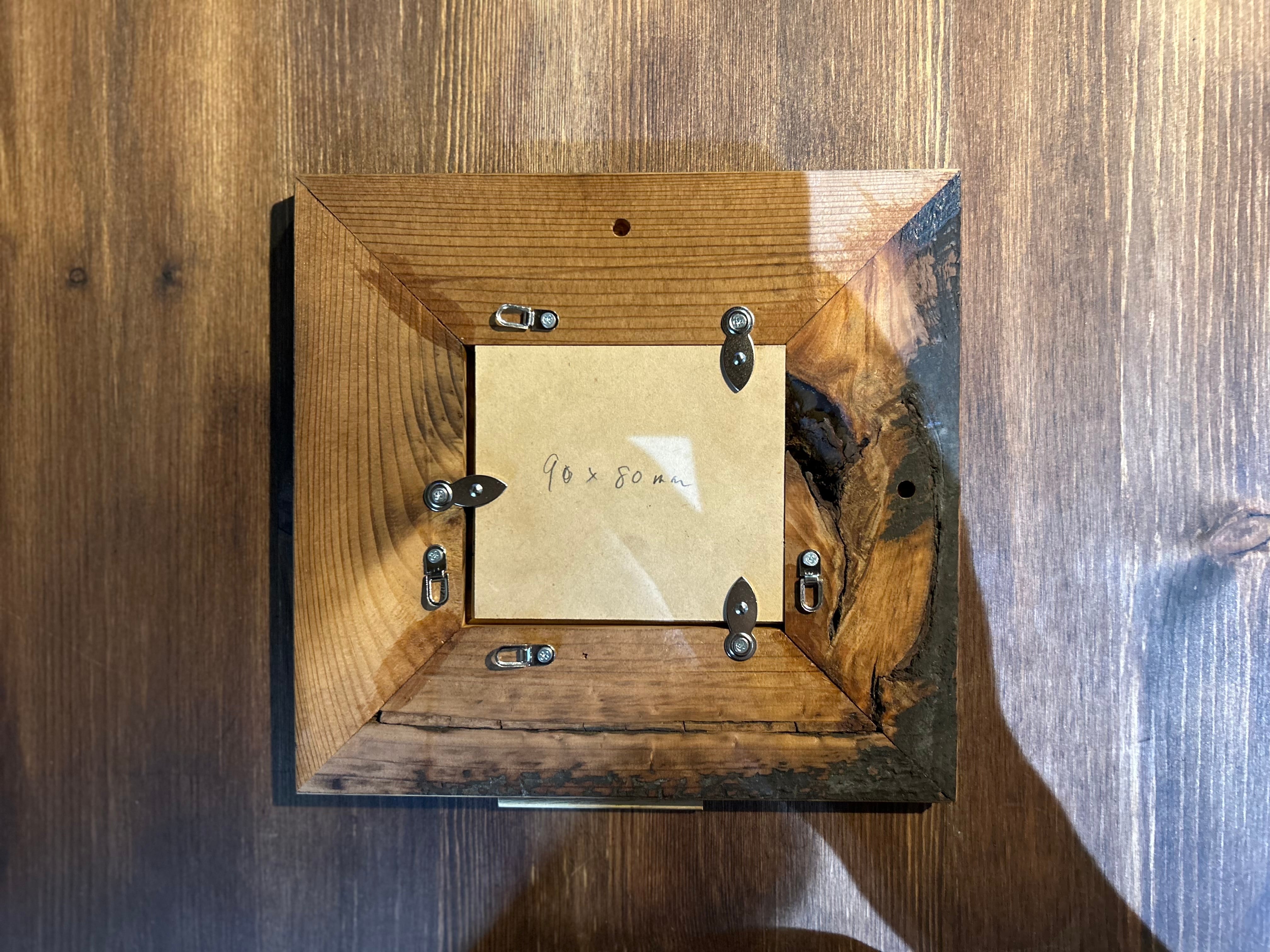 幅広い材を使用して燻された雰囲気をそのままに額縁にしています。