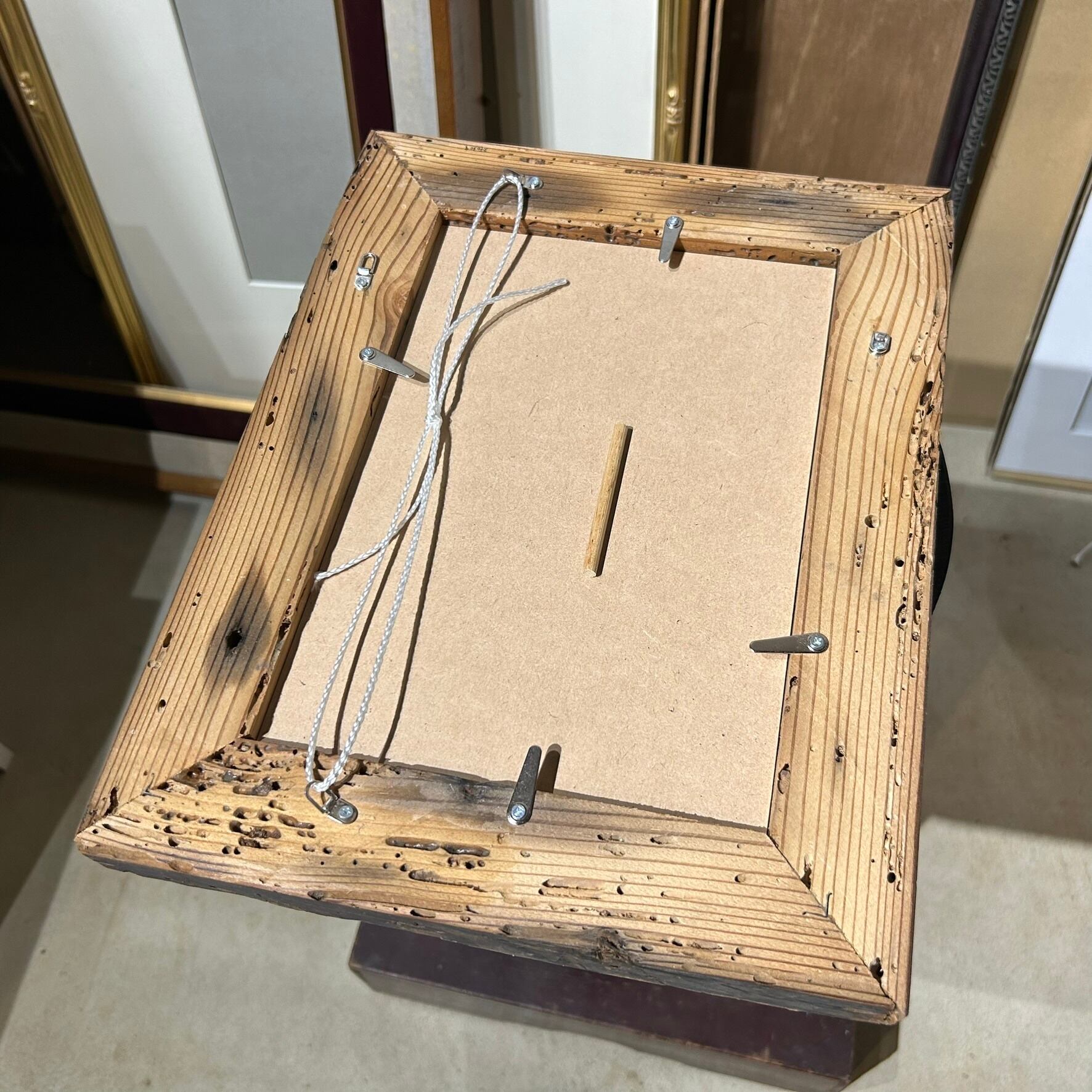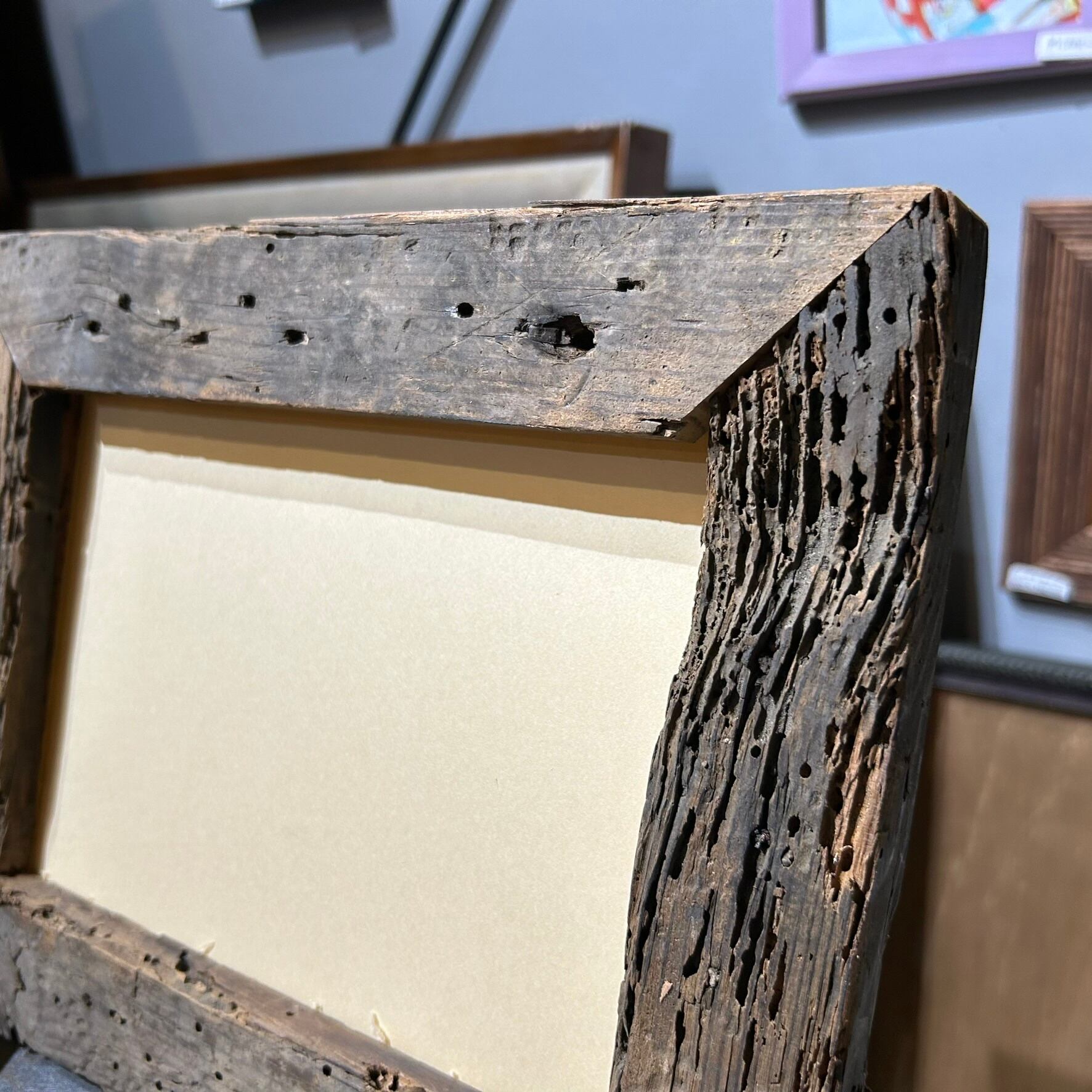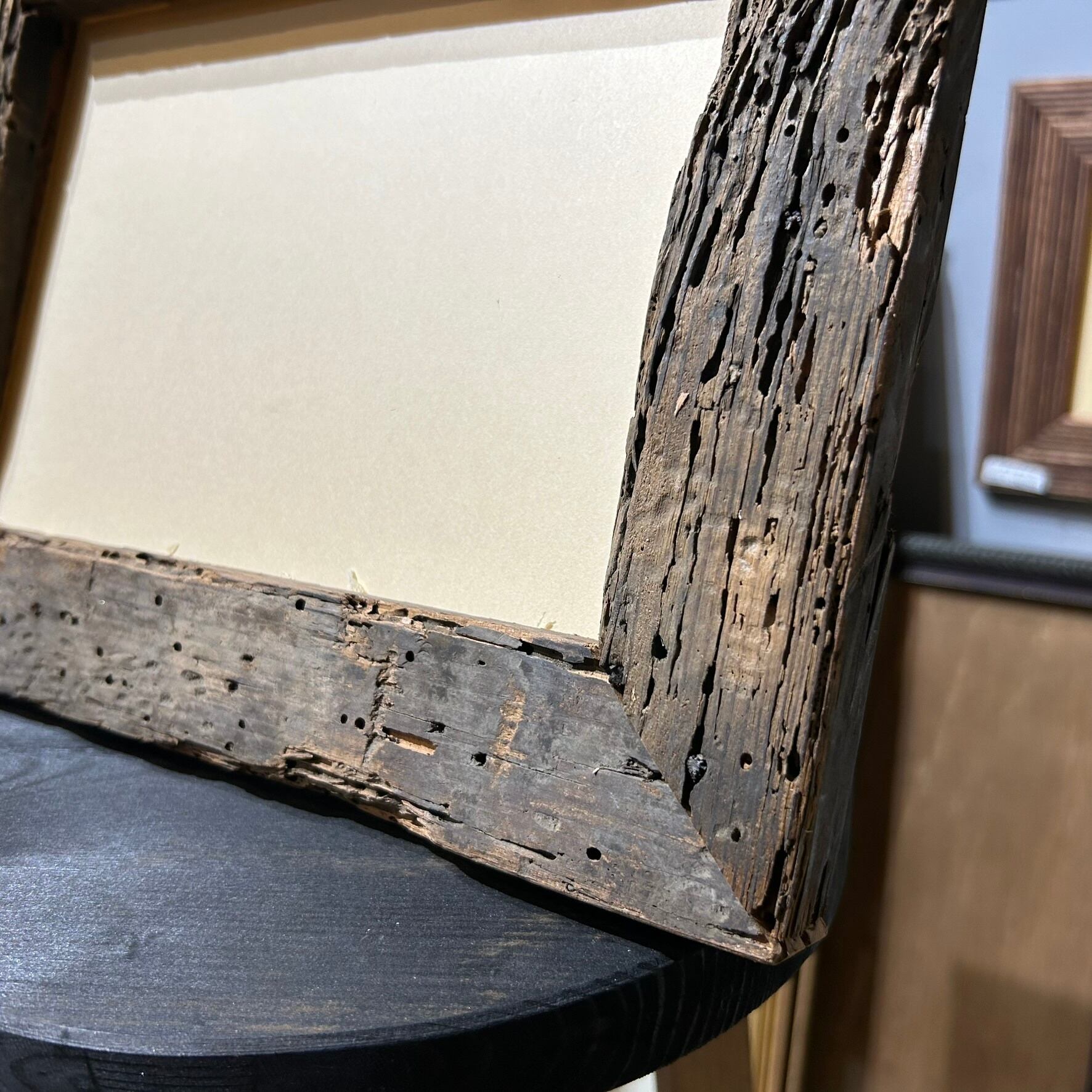 虫食いが進んだ古材を丁寧に清掃、使える部分を入念に選別し額縁にしました。