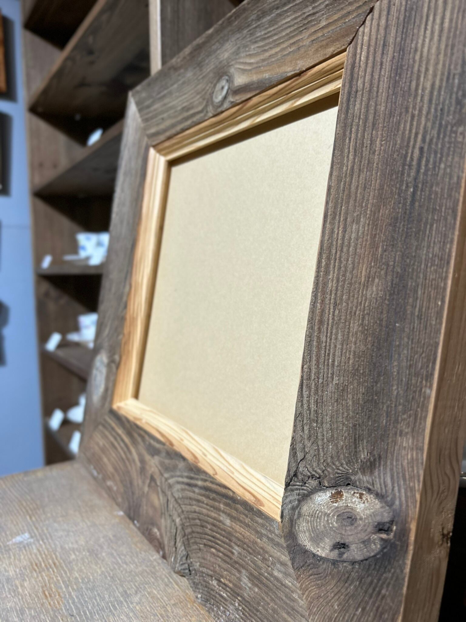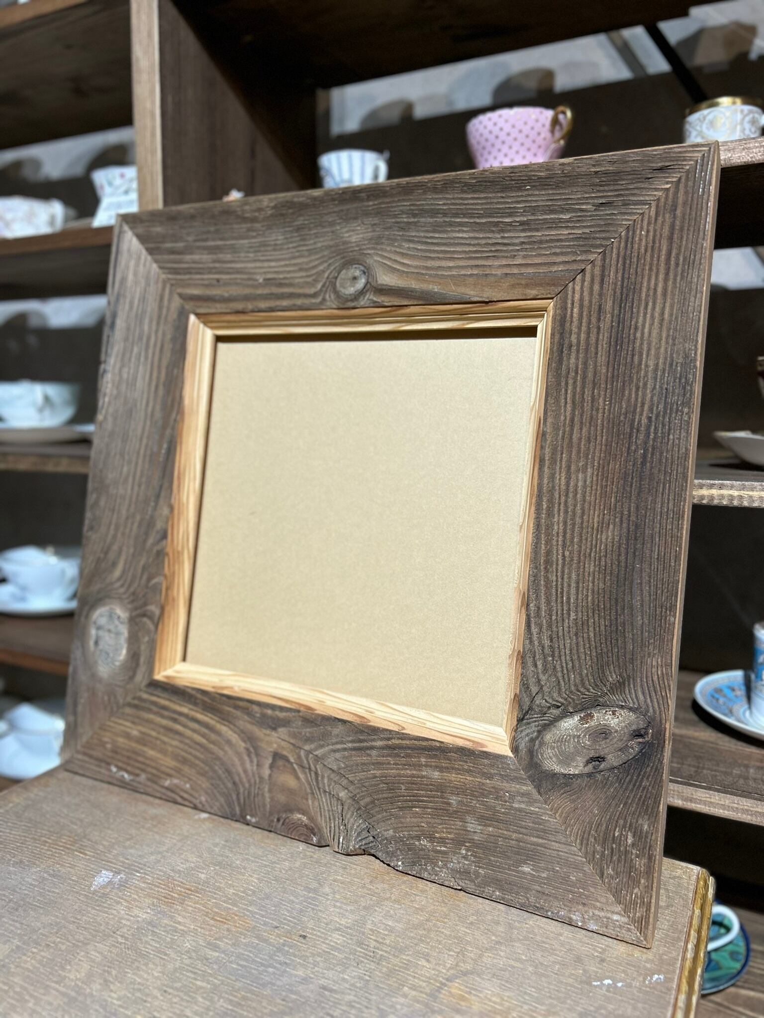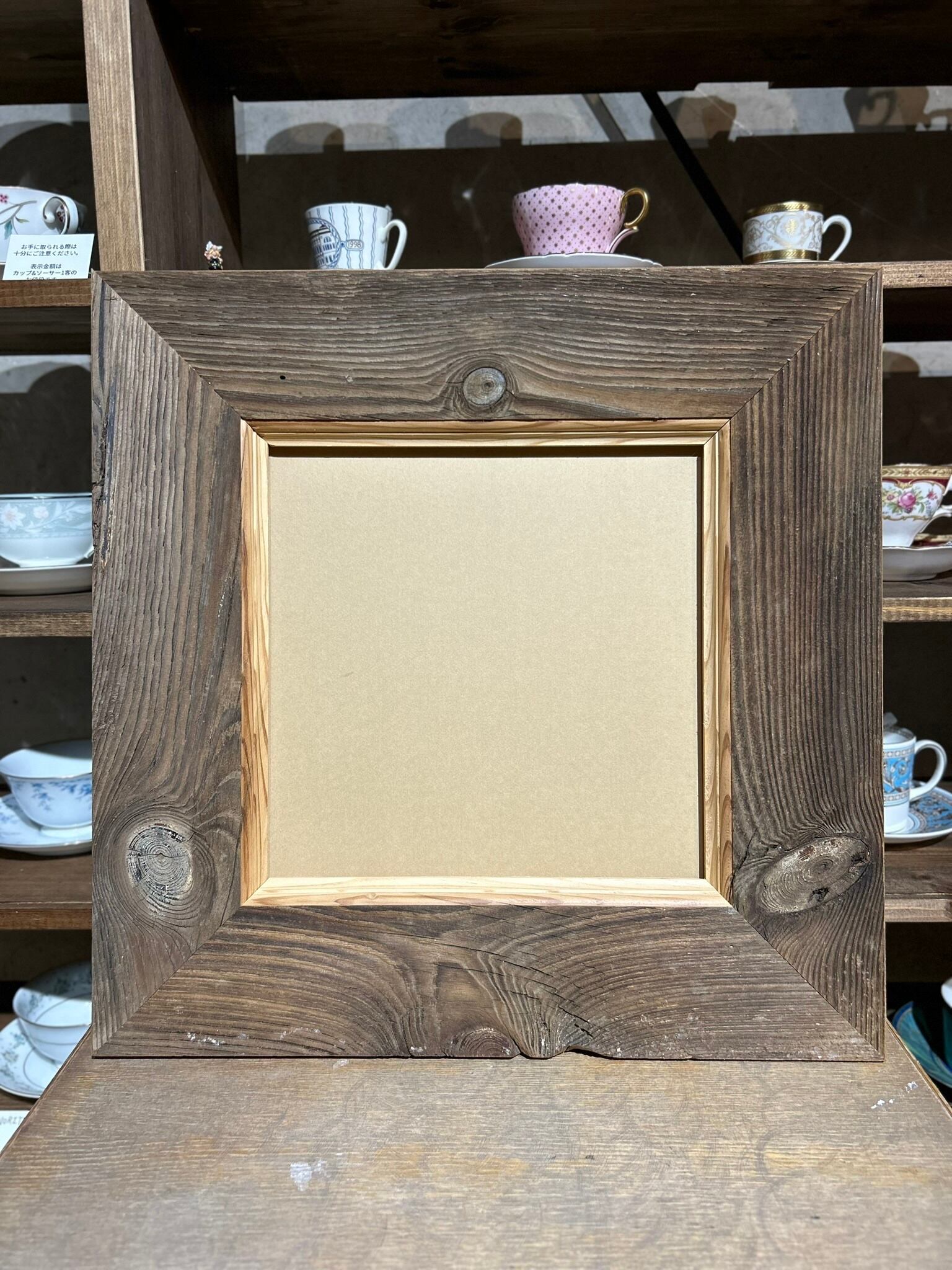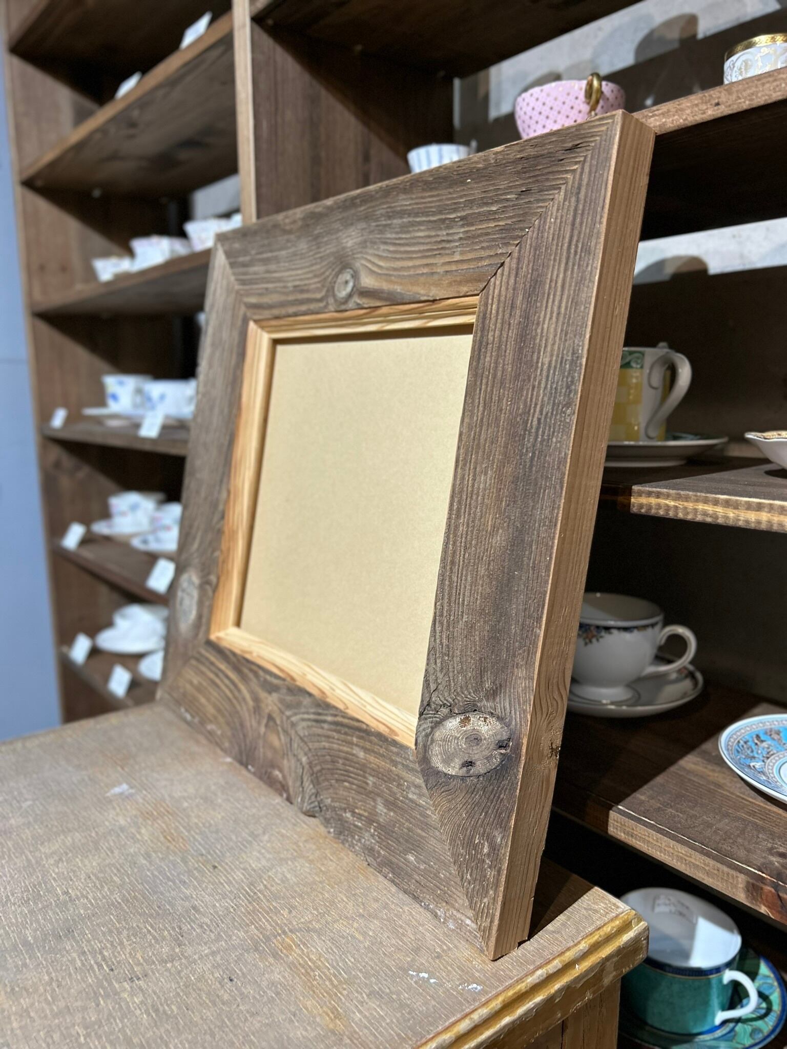 特徴的な木目の古材を贅沢に使用し、さらに内側に額装したものを強調するような加工を施しました。