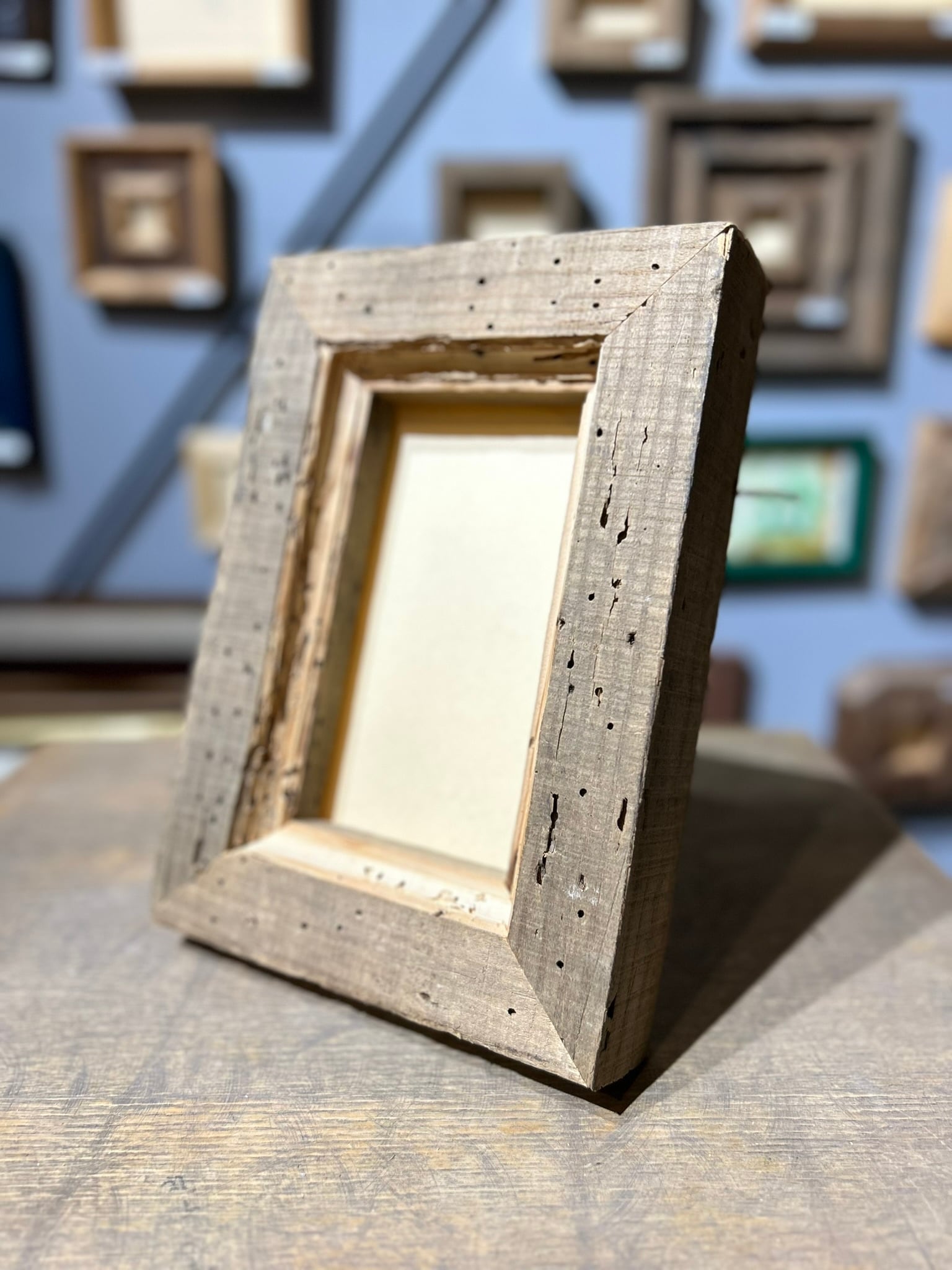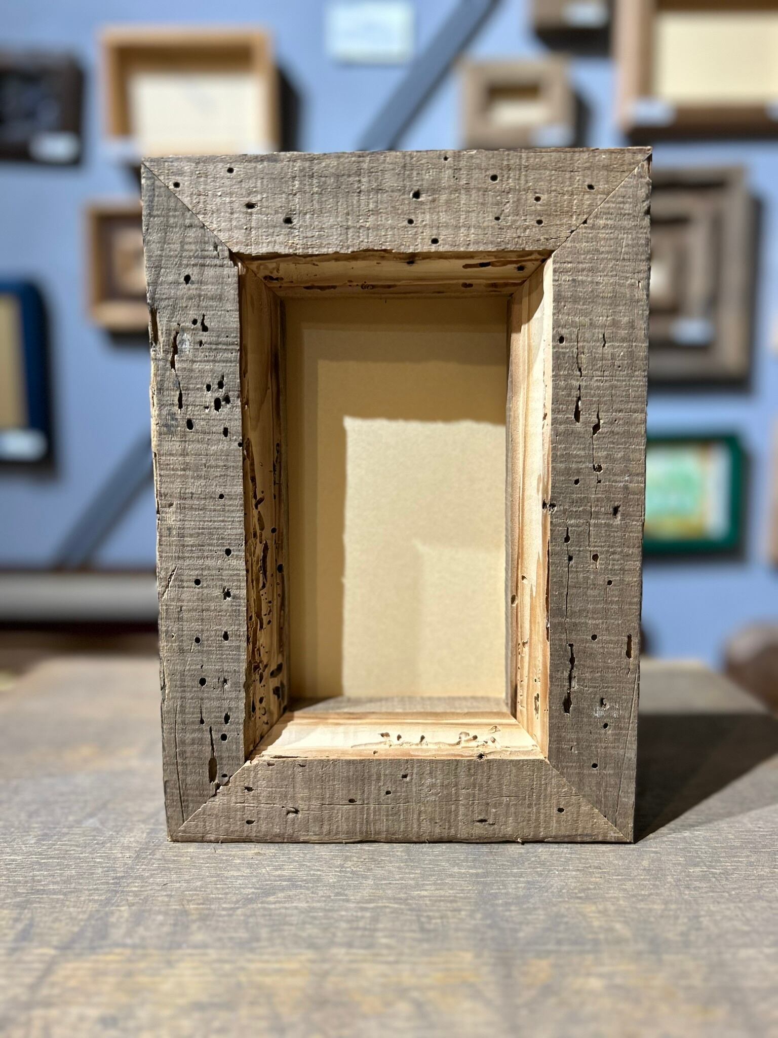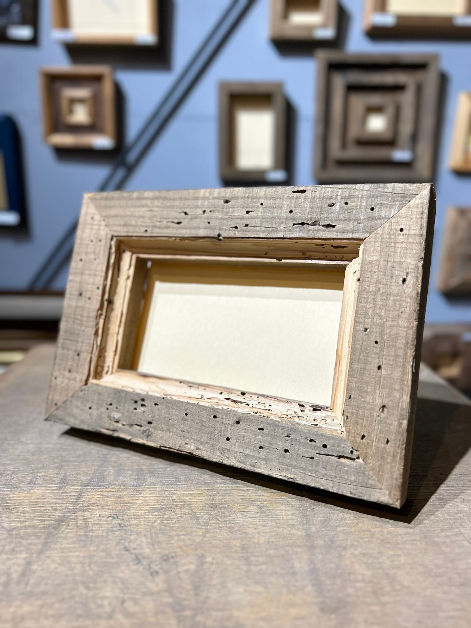 虫食いのある古材をフレームにし、内側に目を引く加工を施しました。