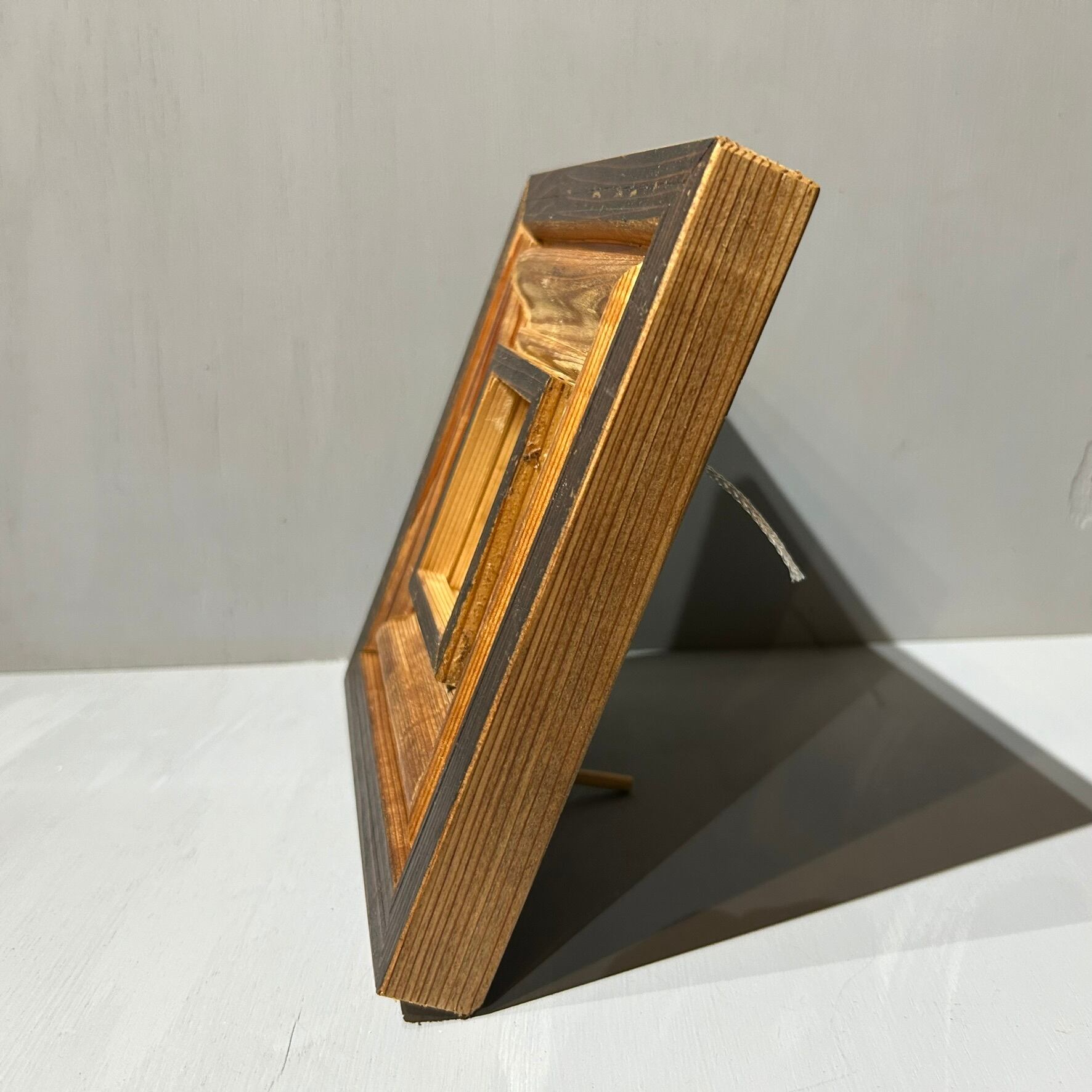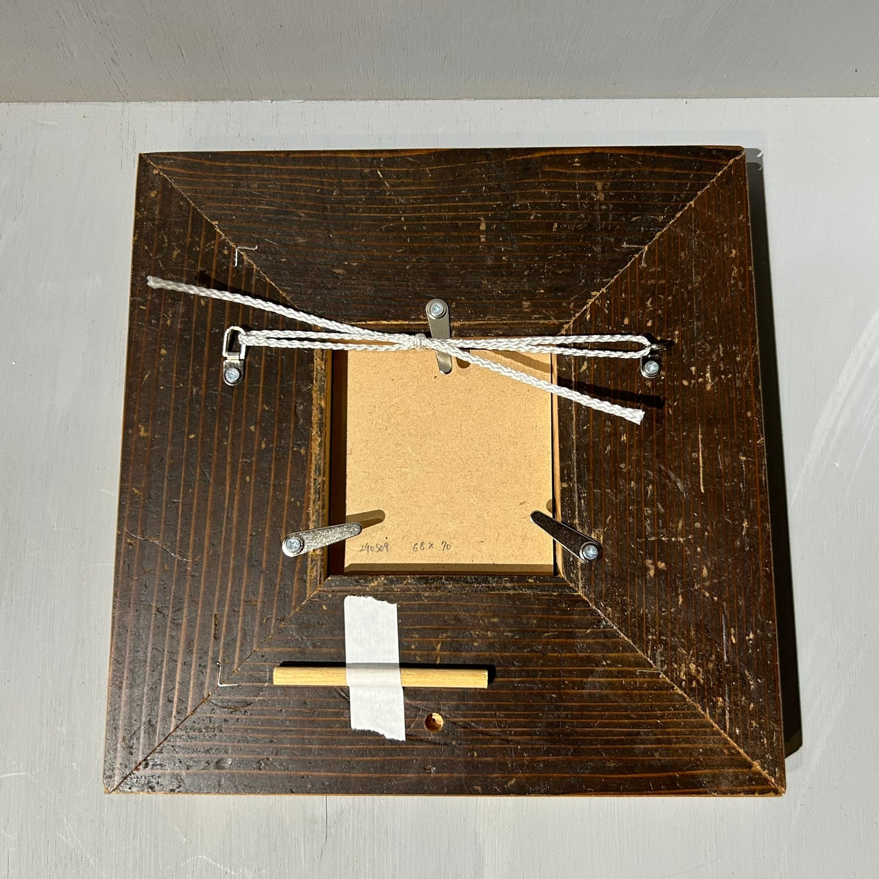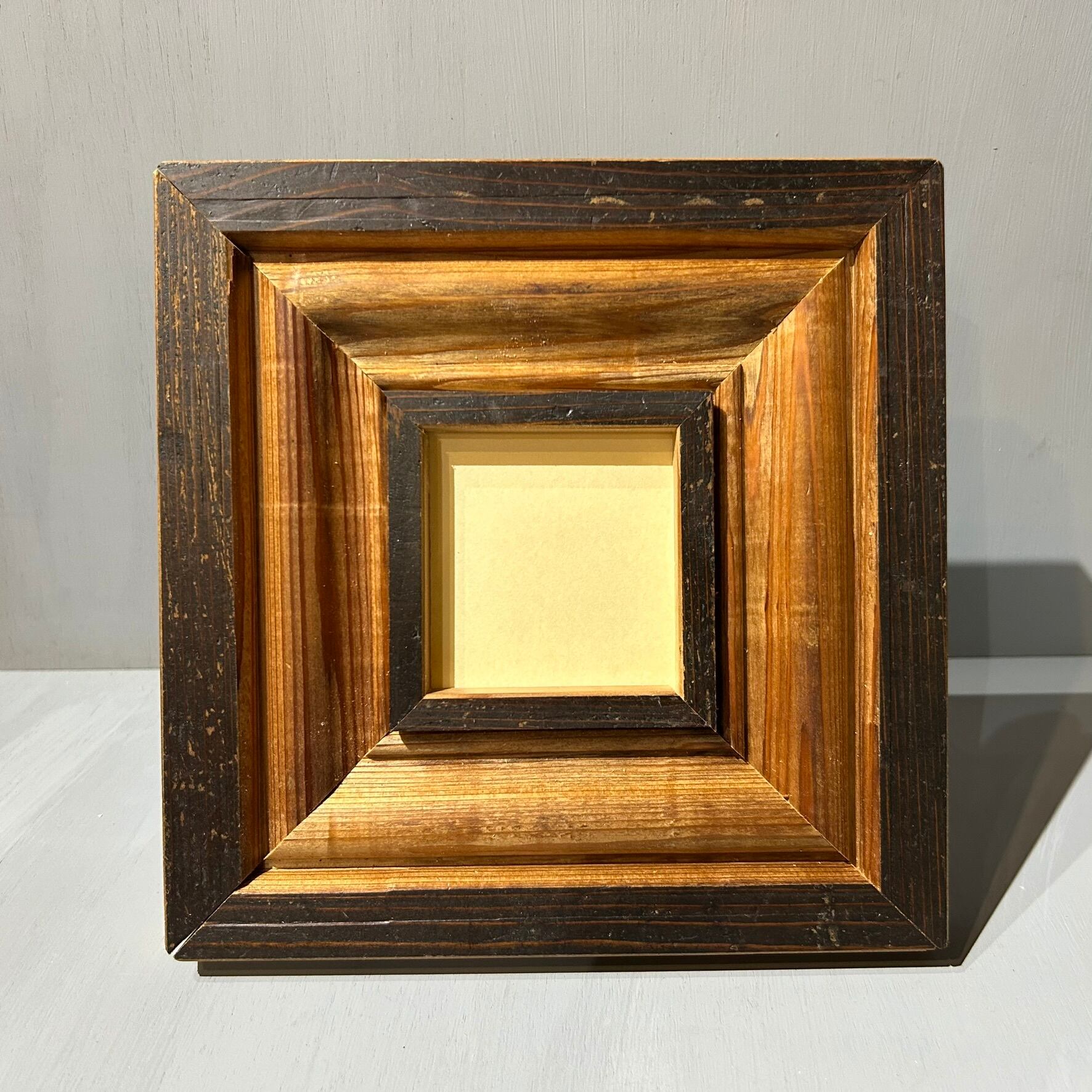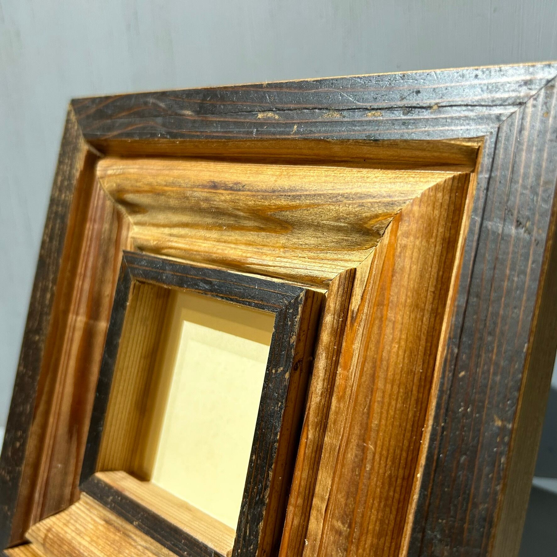 古い家具の棚板だった杉の古材を棚板の時の塗装を残しつつ、額縁にしました。