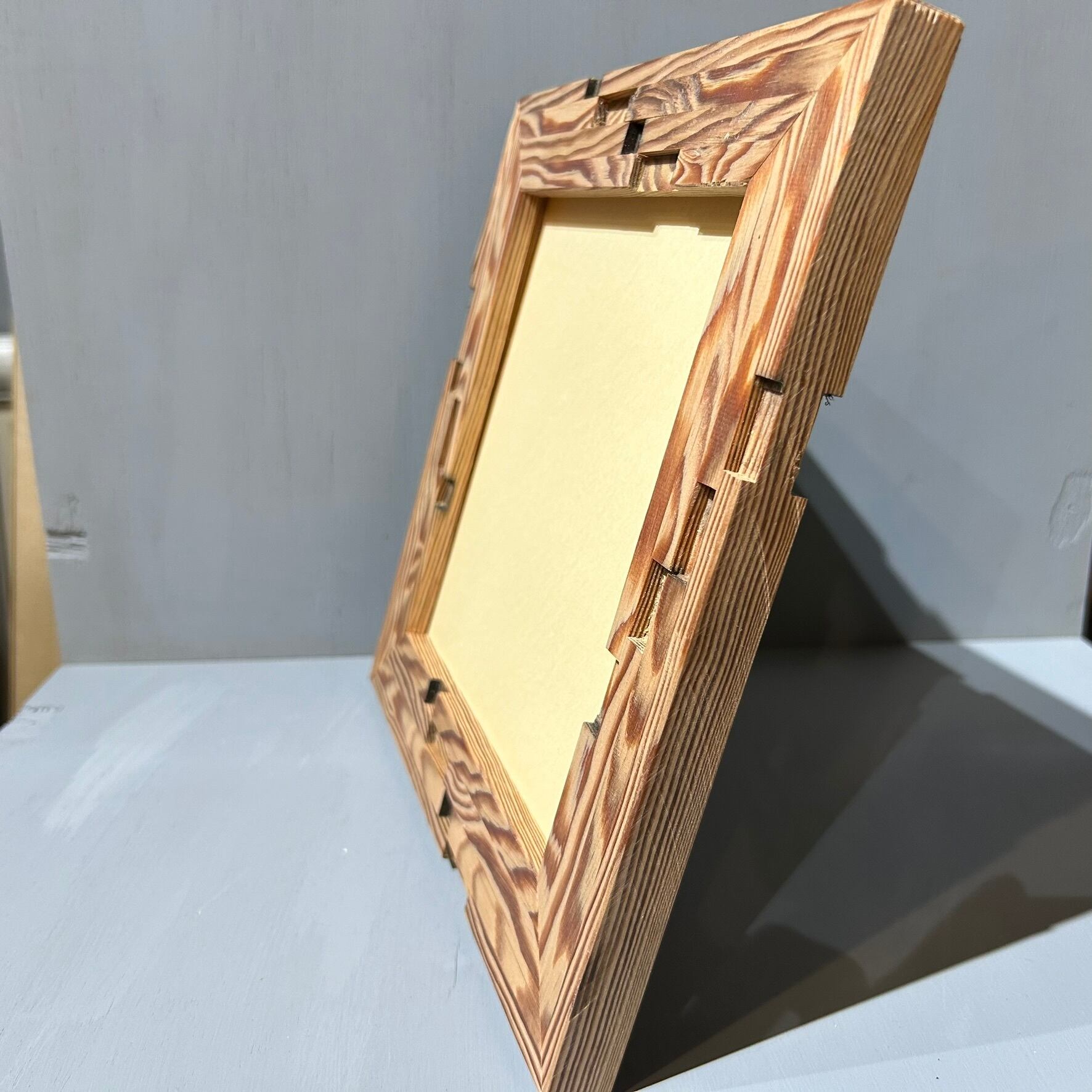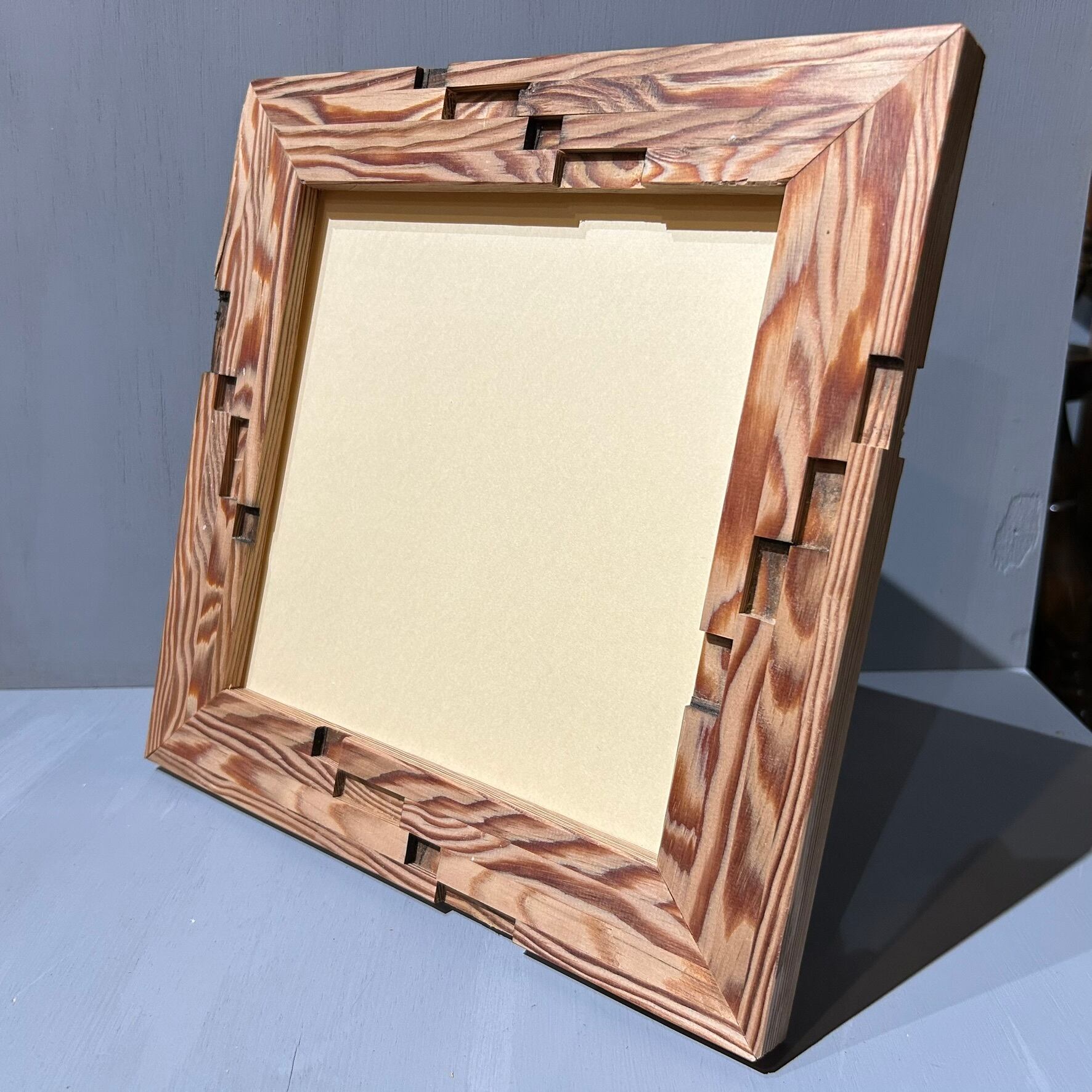 家具に使われていた古材をより細くしたうえで組み合わせ、木目と加工の跡が楽しめる額縁にしました。
